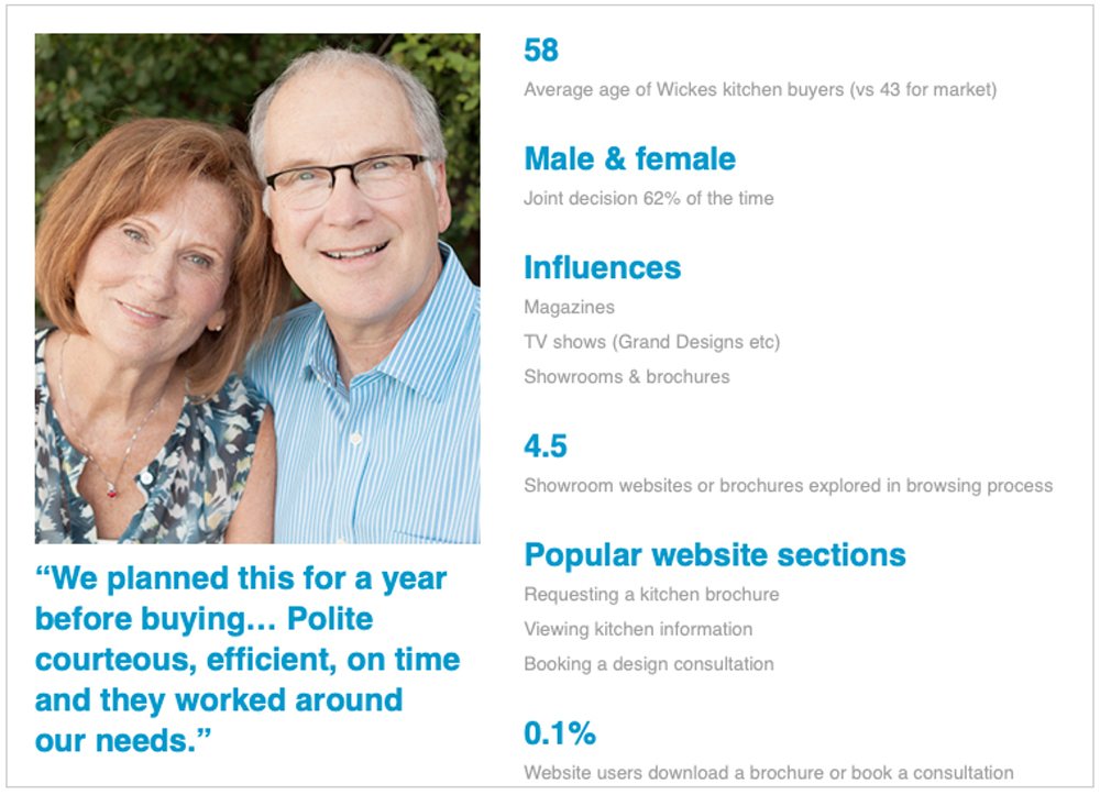 Market findings revealed the average age of a home improver who had purchased a Kitchen in the last 12 months had an average age of 43. With regards to the customer base within that same period, the average age totalled 58 years old. 62% of prospects made the purchase decision as a couple, where as 32% were sole decision makers. Females participants were more likely to be the final decision maker regarding brand, design or finish. More than 60% of participants interviewed would employ professional help for at least some aspect of the overall project, strengthening the business need for highlighting the installation service Wickes offer.