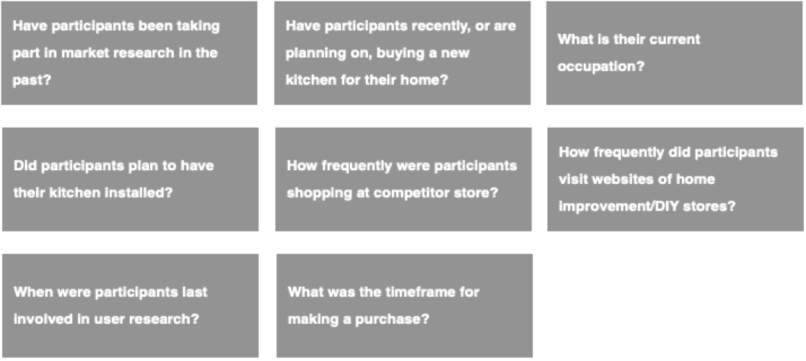 As part of the screener subjects were asked a range of questions to justify their suitability. Ideally we wanted to recruit as many users as possible who were currently in the process of a purchase decision, the team were happy if customers had completed a Kitchen related project in the last 3 to 6 months; ensuring we maintained the highest quality of feedback. We then added the following questions as part of the recruitment screener.