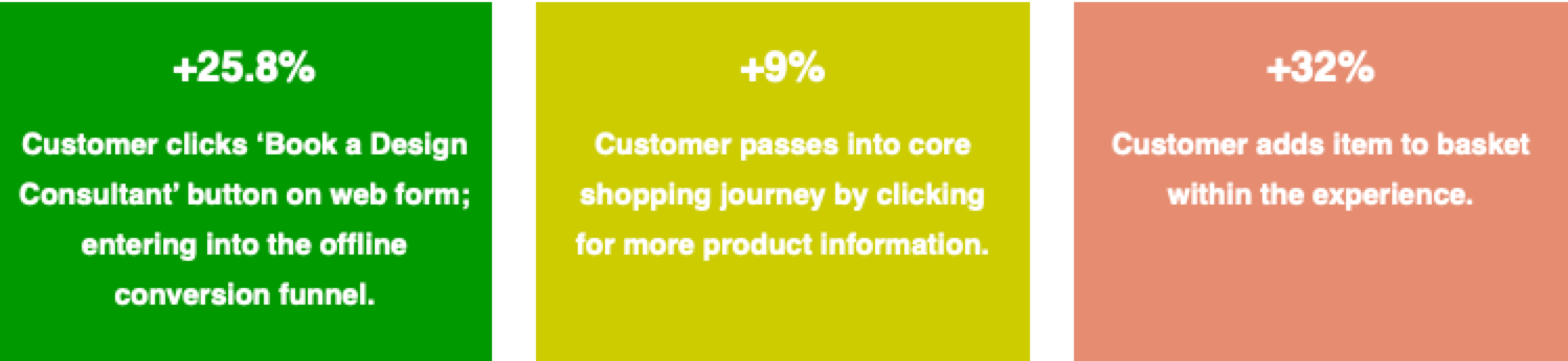 Now we had a framework to work within, the team created developed some mid-fidelity wireframes within Axure. Working to a 24 column grid the digitisation process was really smooth. We played with the outputs over 3 iterations making sure we had taken the proposition and customer research into account for both Ready to Fit and Showroom products. Key research from the current proposition indicated that users struggled to book a design consultation; by increasing the prominence of this link on both mobile, tablet and web was key to exceeding project KPIs. Using regular show and tell sessions with developers to ensure all proposed interactions were possible, we rapidly grew into a position where we were comfortable with the output; keeping stakeholders engaged throughout the sign-off process.